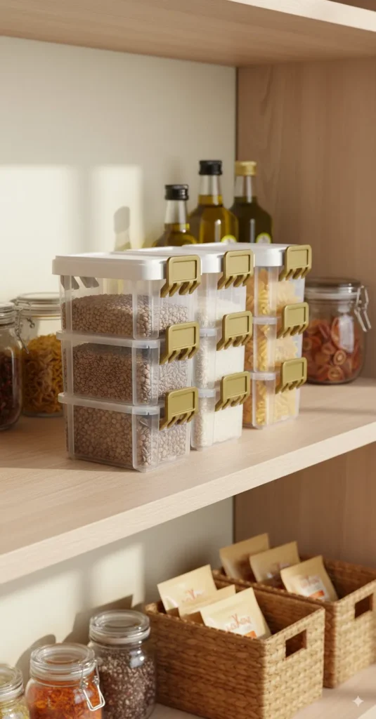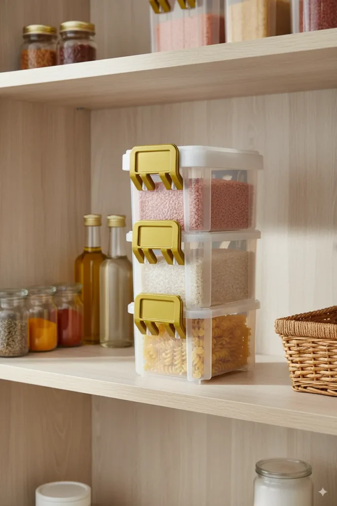 Stackable, transparent 3-layer storage containers with golden clip locks – perfect for storing grains, pasta, snacks, and picnic food.