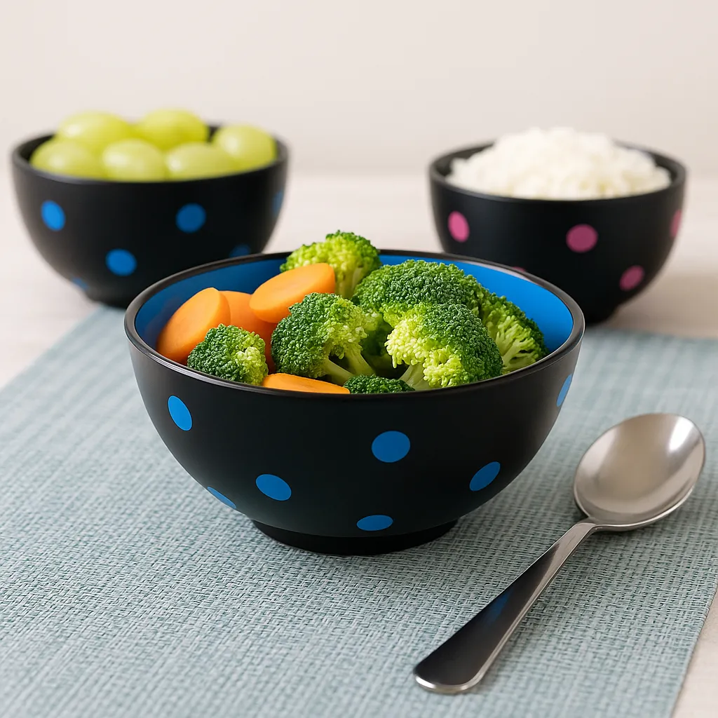 Eye-Catching Design – Black exterior with playful blue polka dots and a glossy blue interior.