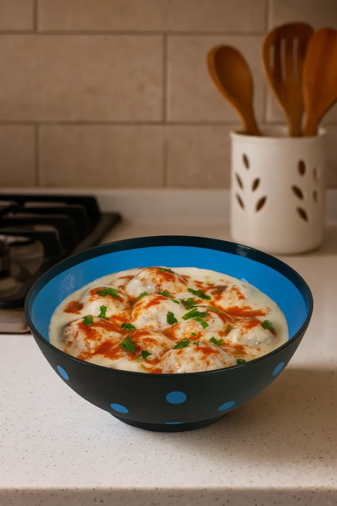 Stylish blue polka dot serving bowl – perfect for salads, fruits, rice, snacks, and curries, adding a modern and playful touch to your dining table.