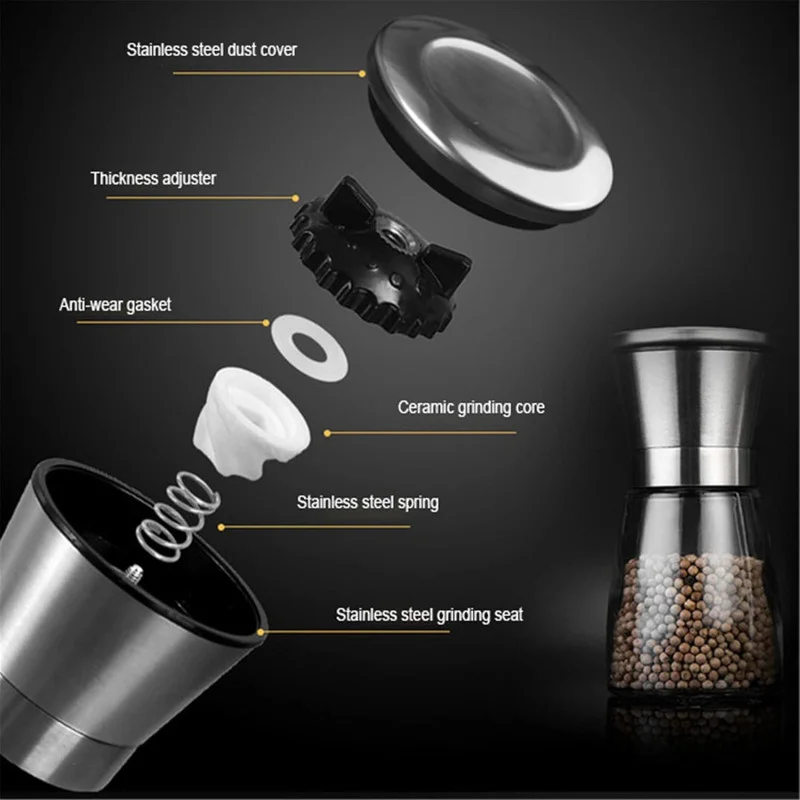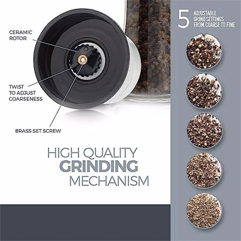 Adjustable crusher delivers coarse to fine seasoning for cooking and table use.
