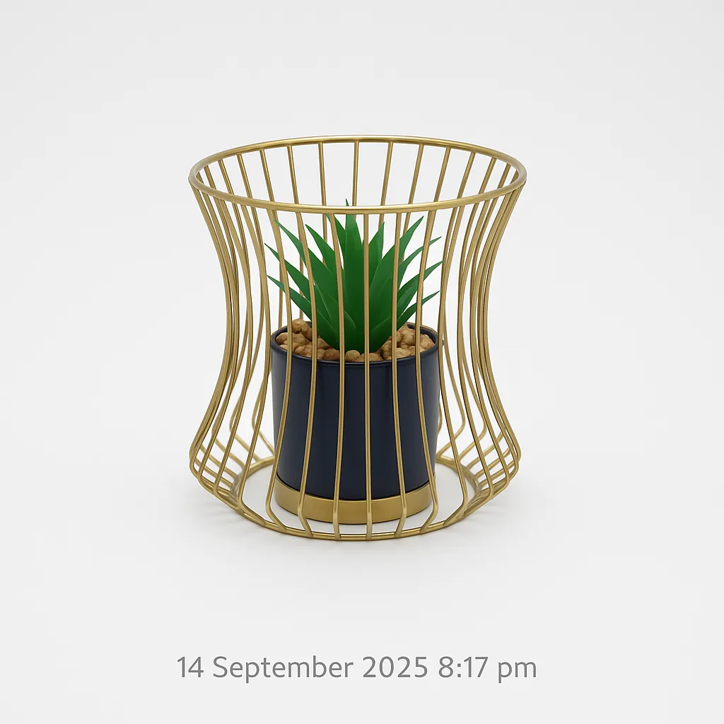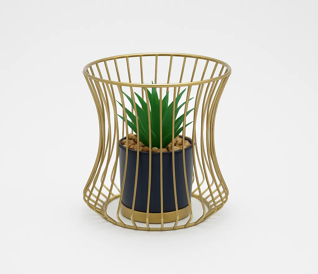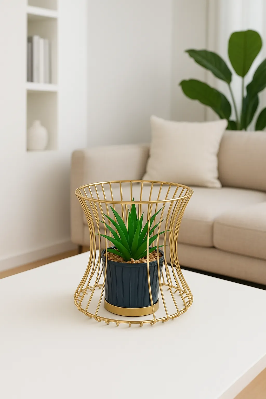 Bring sophistication into your space with the Golden Hourglass Metal Planter with Artificial Plant. Designed with an elegant flowing wire-frame structure in a golden finish, it holds a realistic artificial succulent in a stylish black pot. Perfect for coffee tables, bookshelves, dining areas, or office desks, this decorative piece combines contemporary charm with zero-maintenance greenery, making it an ideal accent for any home or workspace.